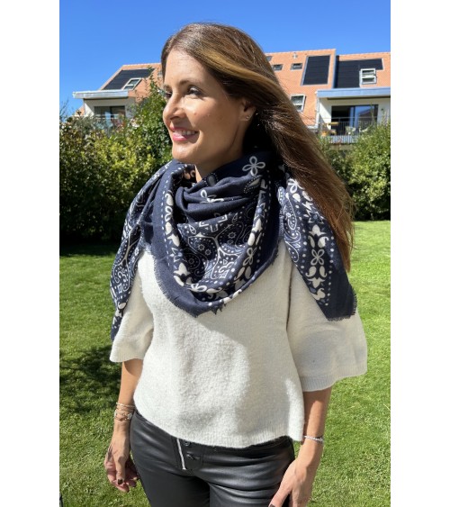 Ajouter au panier Liste de souhaits Carré bandana marine Prix 49,00 CHF Carré extrêmement doux en maille fine. Imprimé bandana, motifs bleu ciel et blanc sur fond bleu marine. Finition frangée. Existe en bleu marine...