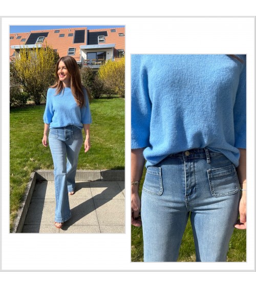 Jeans large et droit, stretch en coton bleu clair délavé, accessoirisé de jolies poches sur le devant.  Denim de qualité extrêmement souple et...