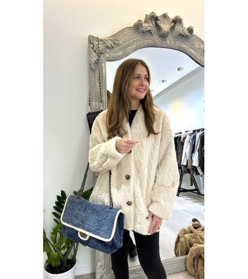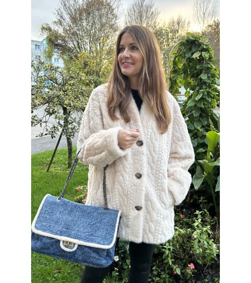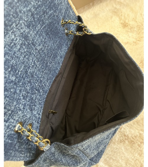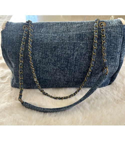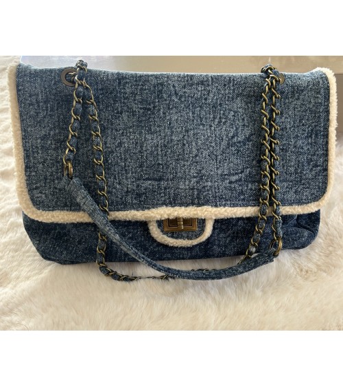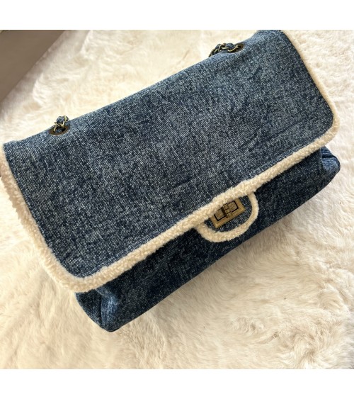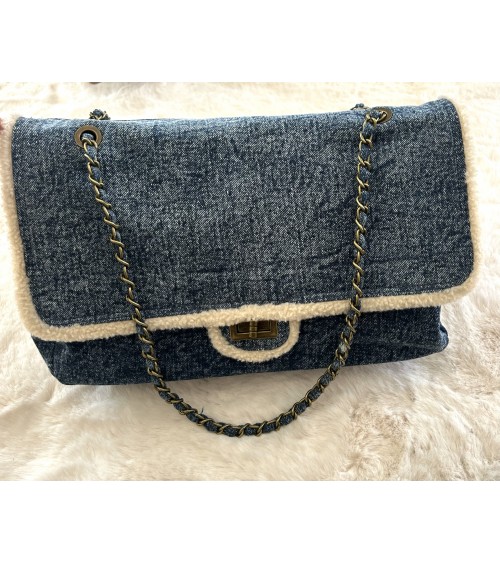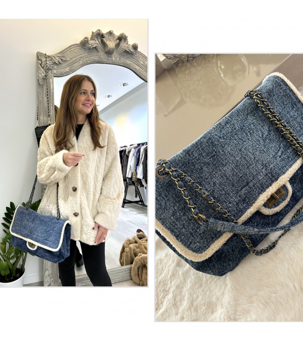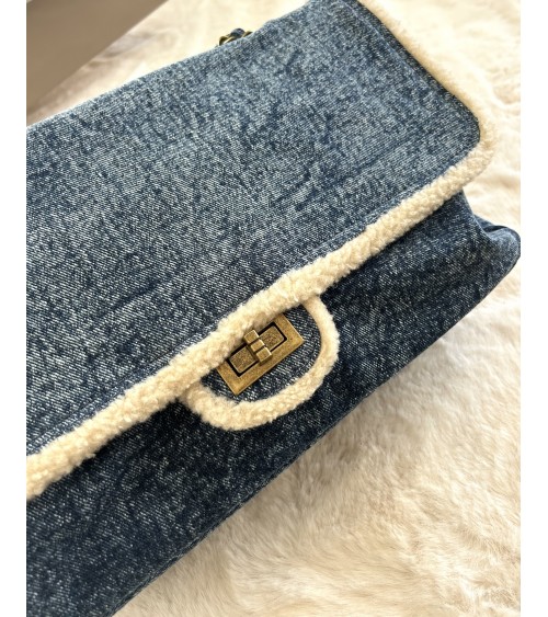 Sac XL en jeans bleu délavé avec fermeture à rabat moutonnée écrue et bijouterie dorée mat. Doublure intérieure en coton noir avec un grand compartiment et trois poches dont une zippée. Une poche extérieure plaquée à l'arrière.