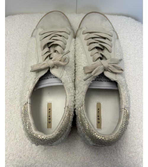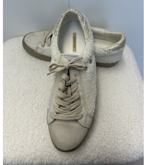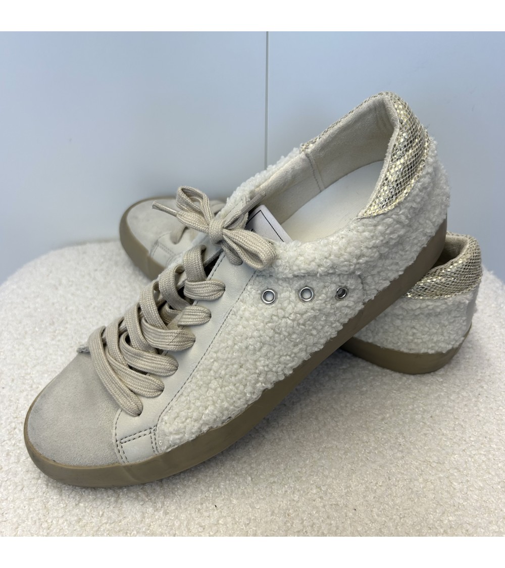 Basket basse en tissu bouclette, suédine et similicuir écru. Accessoirisée de petits ronds en acier perforés sur le côté. Lacet écru. Semelle plateforme beige de 2cm. Modèle très confortable.