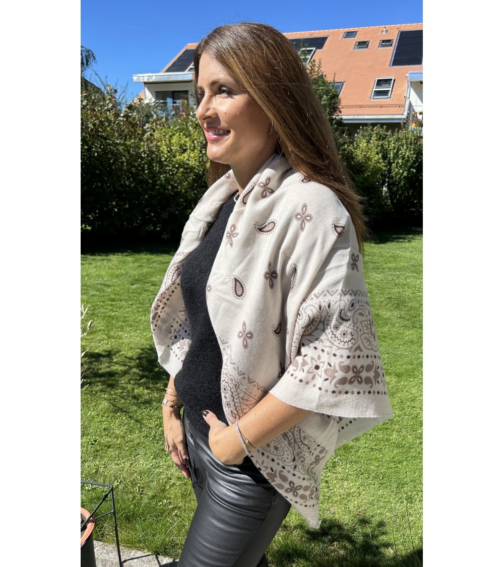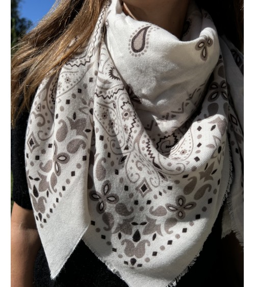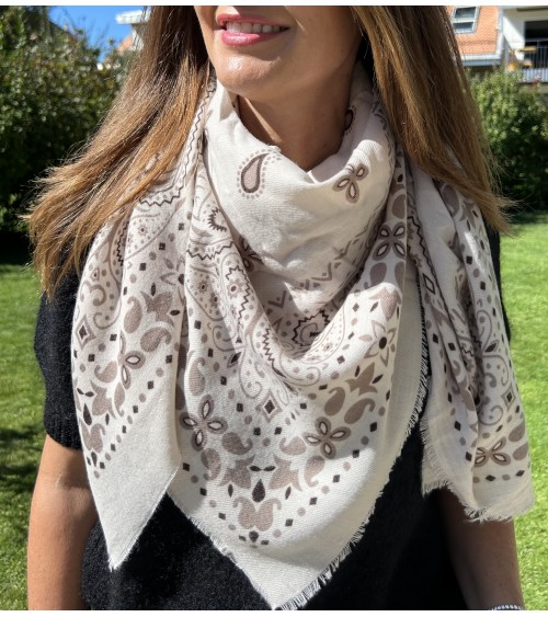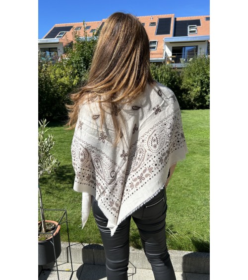 Carré extrêmement doux en maille fine. Imprimé bandana, motifs taupe et marron sur fond beige clair. Finition frangée.