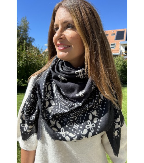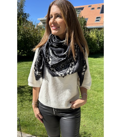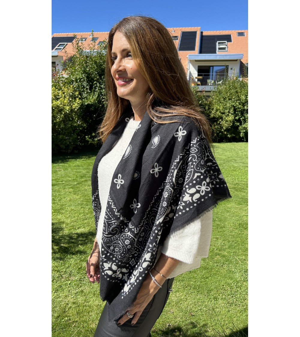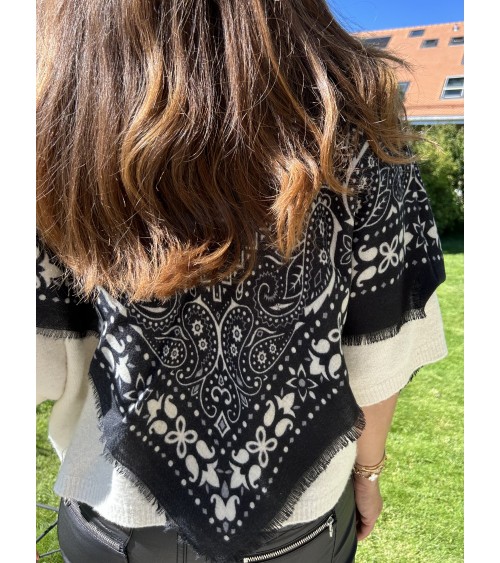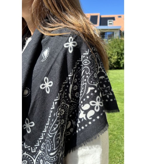 Carré extrêmement doux en maille fine. Imprimé bandana, motifs gris et blanc sur fond noir. Finition frangée.