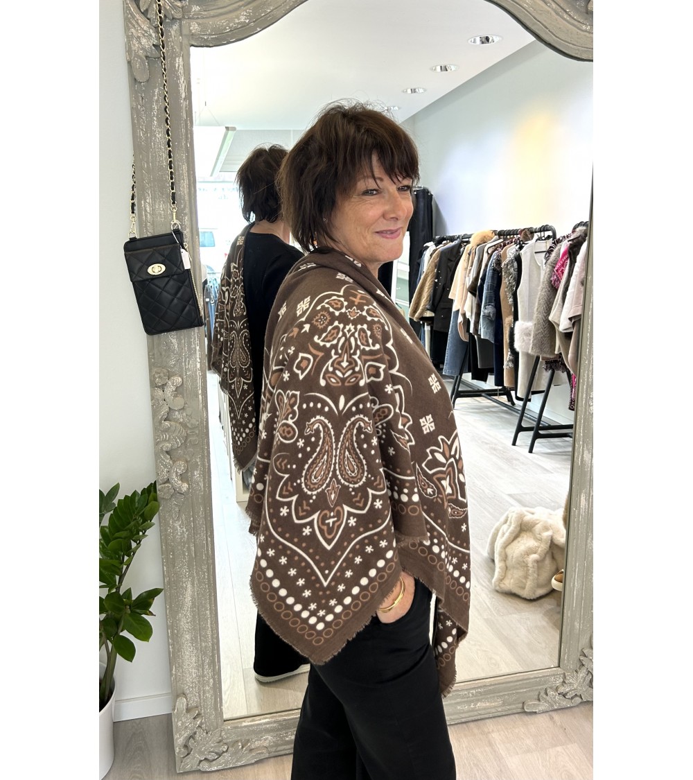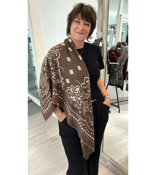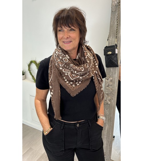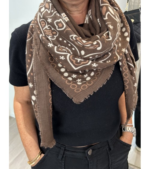 Carré extrêmement doux en maille fine. Imprimé bandana, motifs bleu ciel et blanc sur fond bleu marine. Finition frangée.