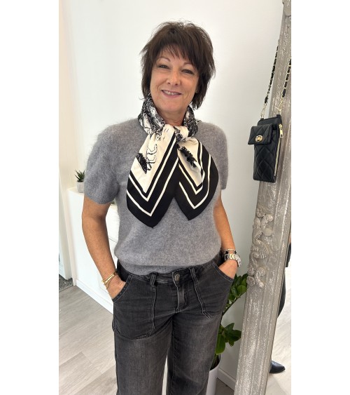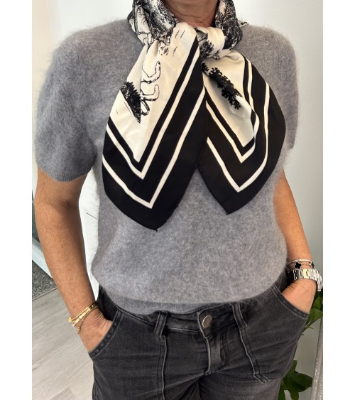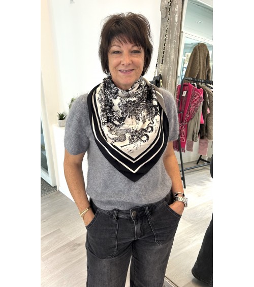 Foulard en soie tout doux à l'imprimé style toile de jouy; motifs dans les tons de noir sur fond crème.