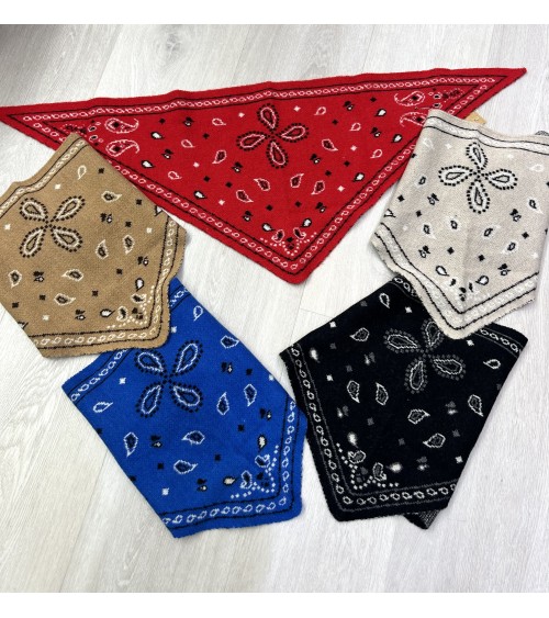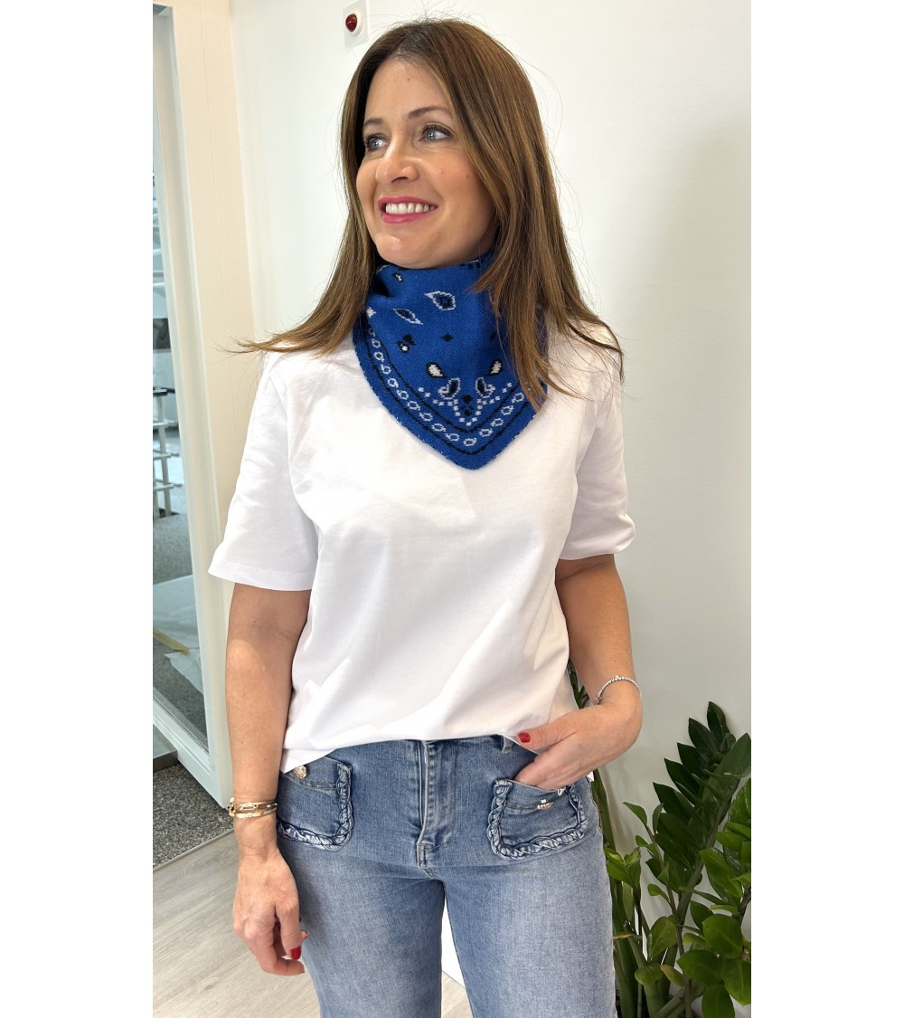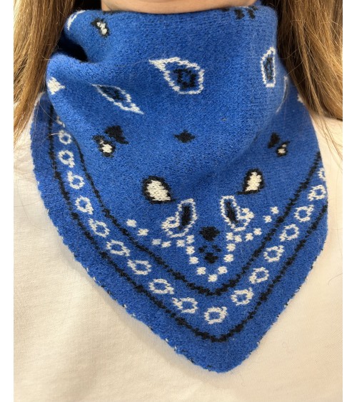 Triangle extrêmement doux en maille fine. Imprimé bandana, motifs noir et blanc sur fond bleu.