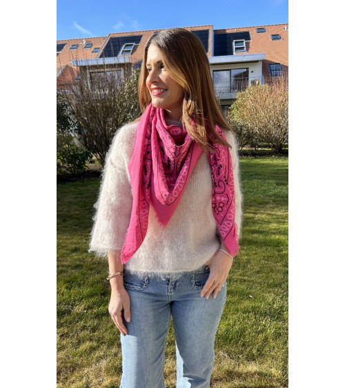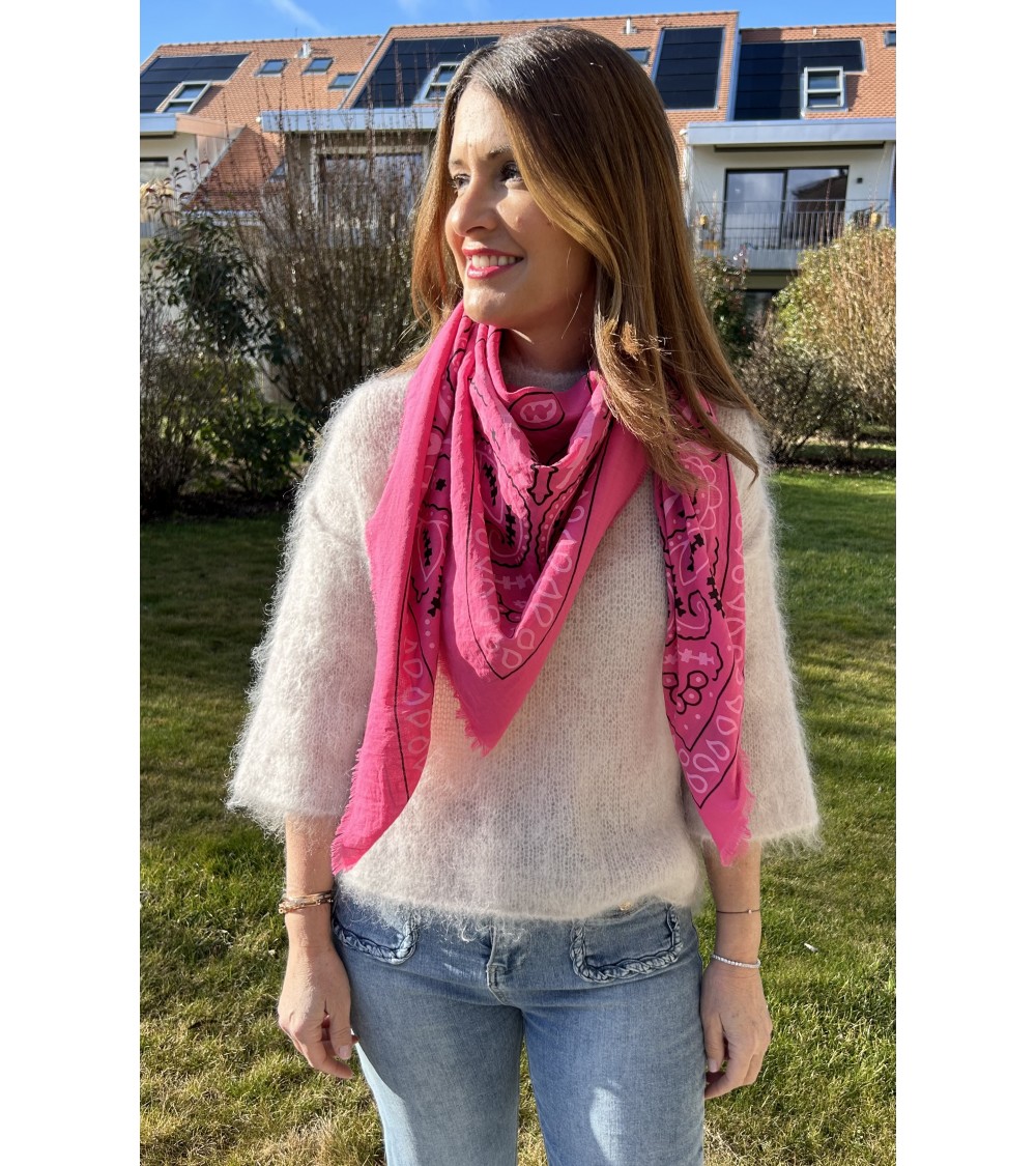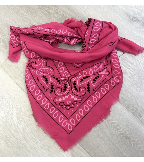 Carré léger et doux en viscose. Imprimé bandana, motifs blancs et noir sur fond rose. Finition frangée.