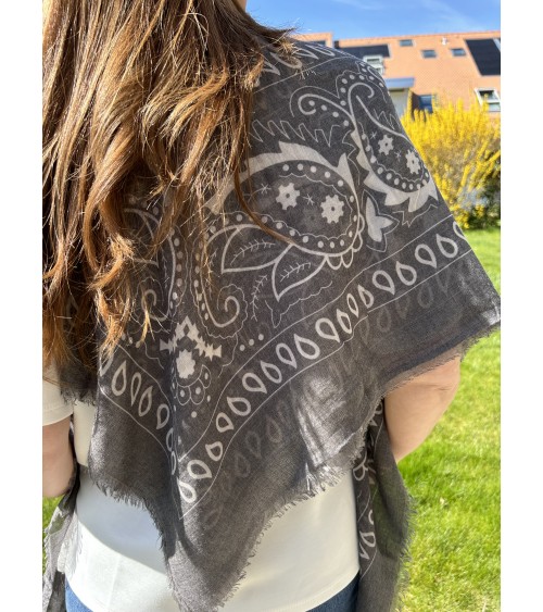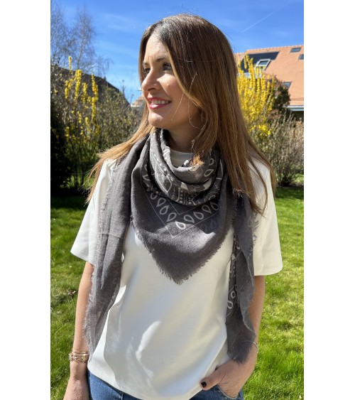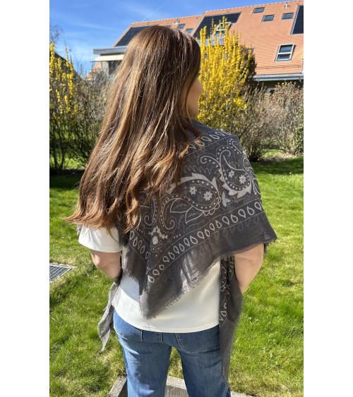 Carré léger et doux en viscose. Imprimé bandana, motifs blancs et noir sur fond gris. Finition frangée.