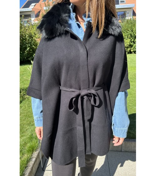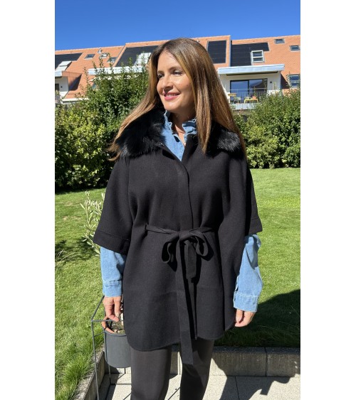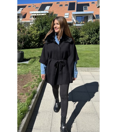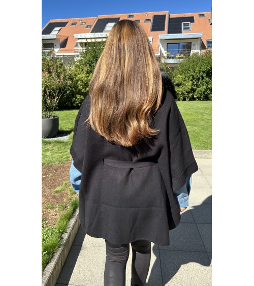 Jaquette (manteau) mi-longue de très belle qualité; elle est toute douce et souple en viscose. Coupe oversize. Col en fausse fourrure amovible. Lien à la taille permettant de la resserrer selon son envie. Fermeture par des boutons pression. Elle est fendue sur les côtés.