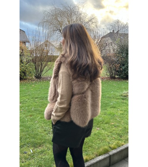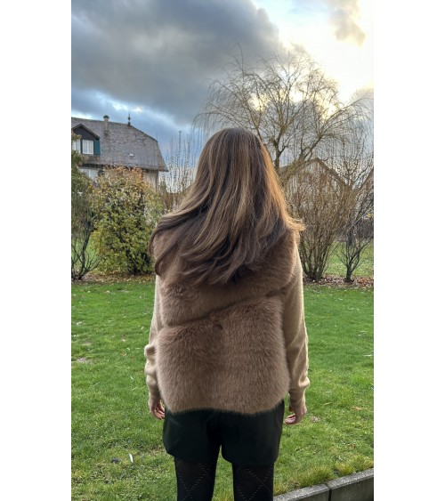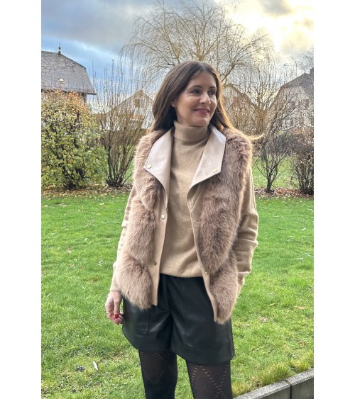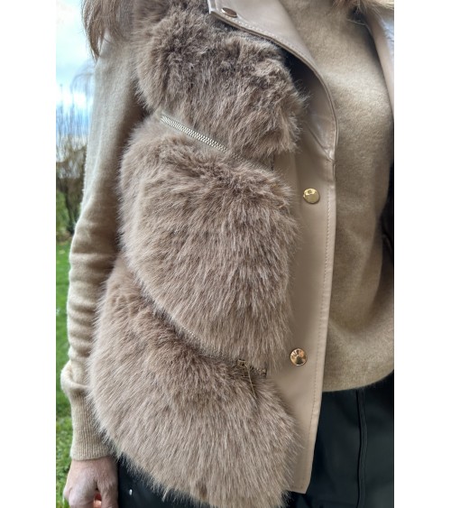 Gilet structuré ultra doux en fausse fourrure accessoirisé de zip factices dorées. Col style perfecto en similicuir camel. Il se ferme aux moyens de pressions dorées. Doublure intérieure.