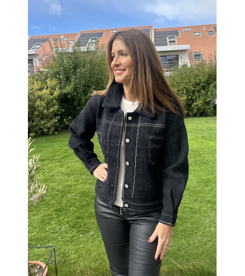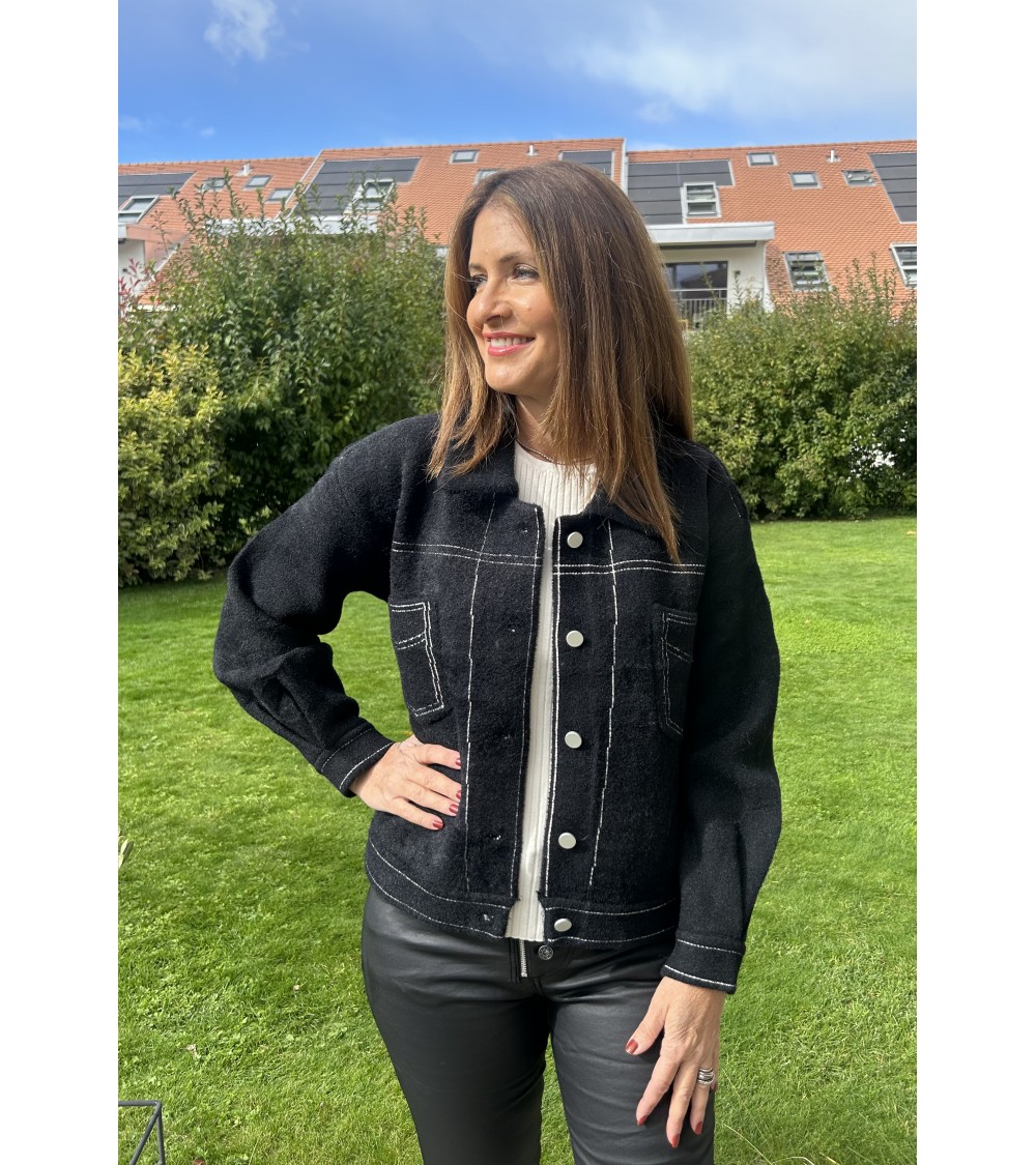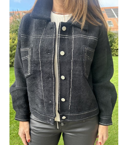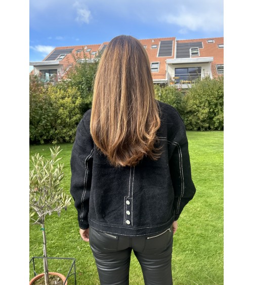 Veste jaquette très souple avec coutures blanches sur fond noir. Fermeture par boutons métalliques argentés mats. Deux poches au niveau de la poitrine. Manches longues.