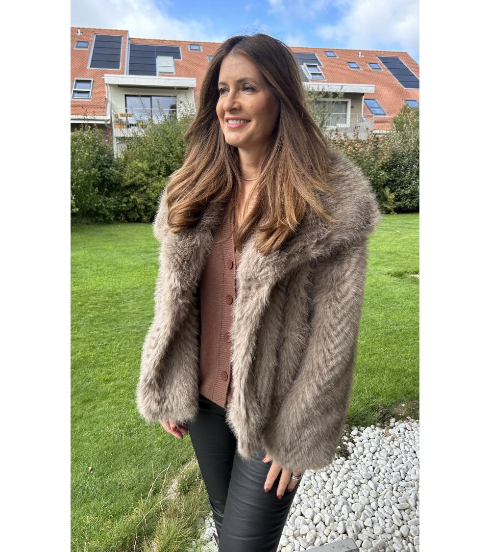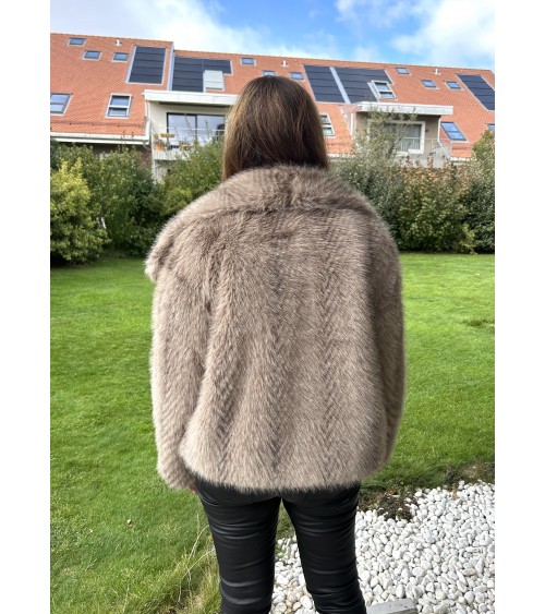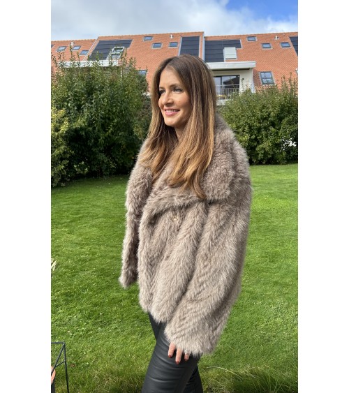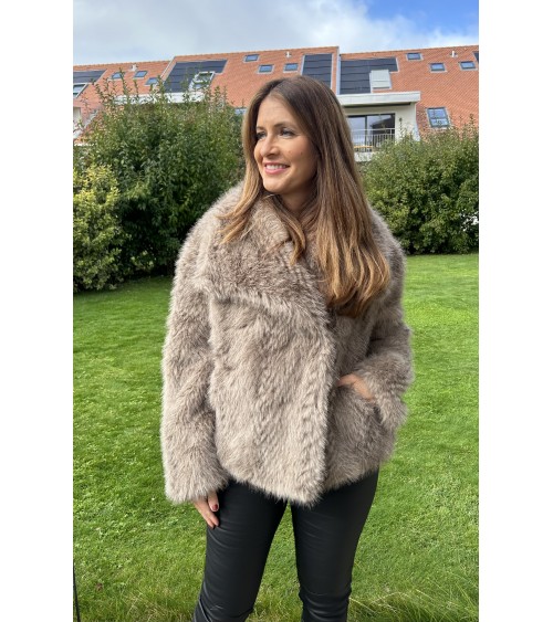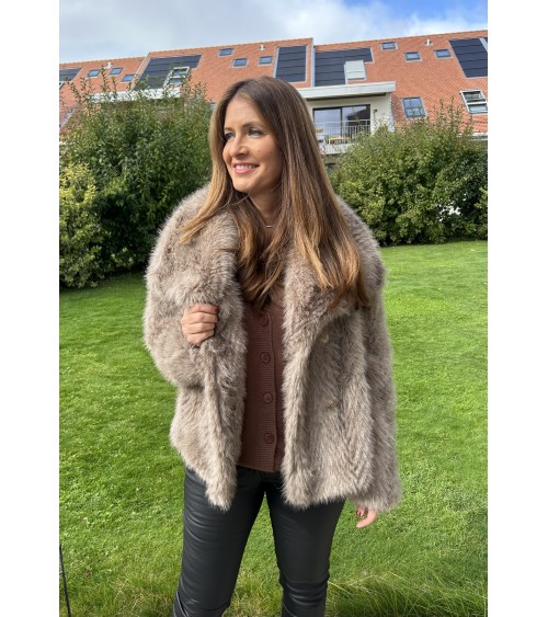 Veste chaude mais toute légère en fausse fourrure de très belle qualité. Effet vison au toucher ultra doux. Grand col avec fermeture par double boutonnage ( boutons pression ). Coupe droite et manches longues. Doublure intérieure en tissu beige.