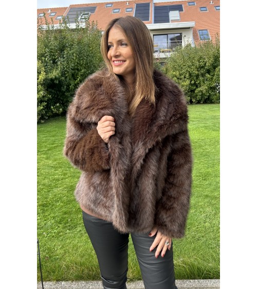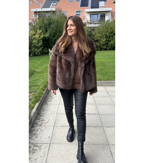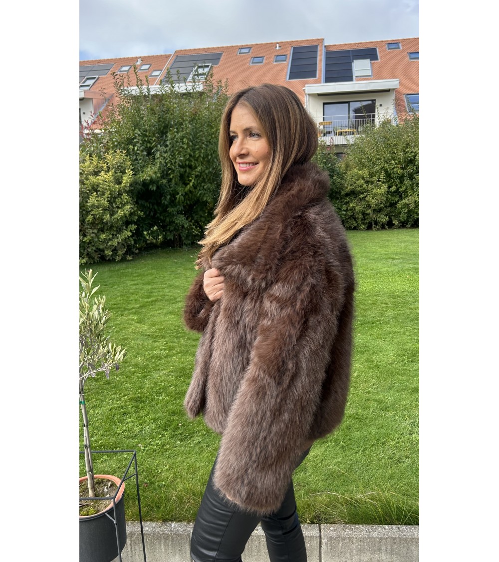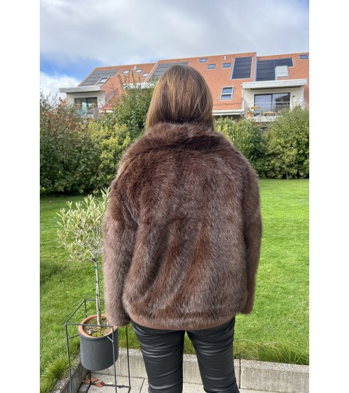 Veste chaude mais toute légère en fausse fourrure de très belle qualité. Effet vison au toucher ultra doux. Grand col avec fermeture par double boutonnage ( boutons pression ). Coupe droite et manches longues. Doublure intérieure en tissu beige.