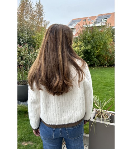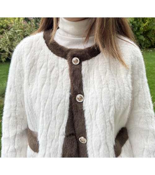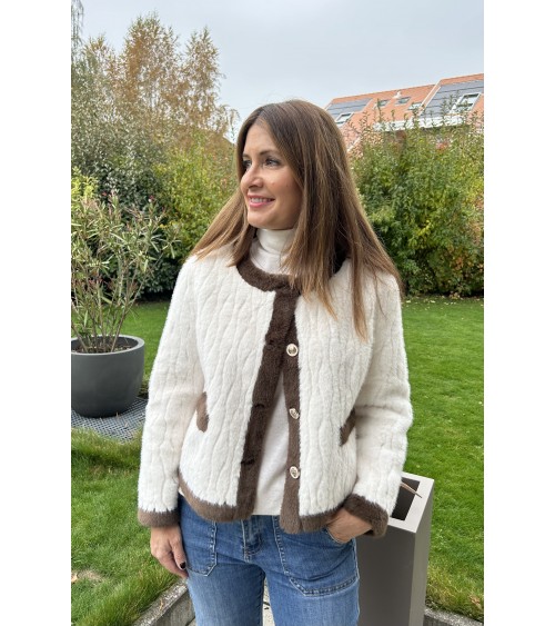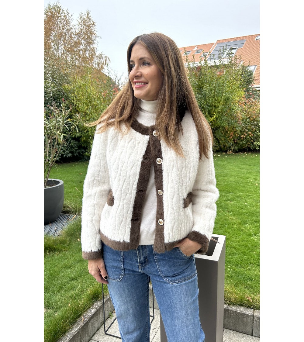 Veste - jaquette en fausse fourrure, structurée et ultra douce dans les tons de crème et marron. Coupe droite et manches longues. Fermeture avant par de jolis boutons dorés. Deux poches avant. Doublure intérieure en suédine