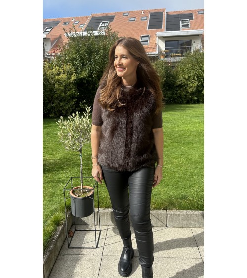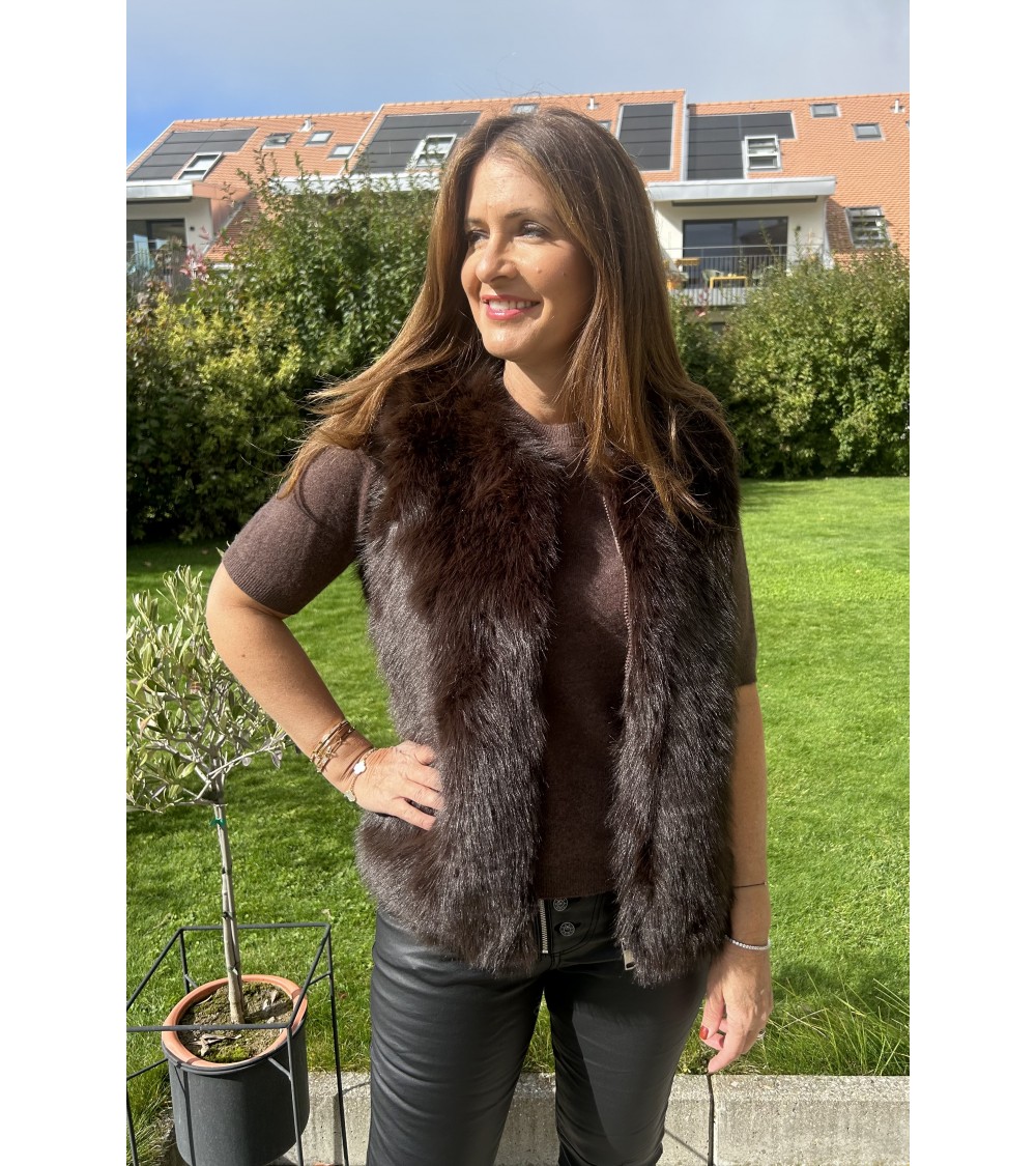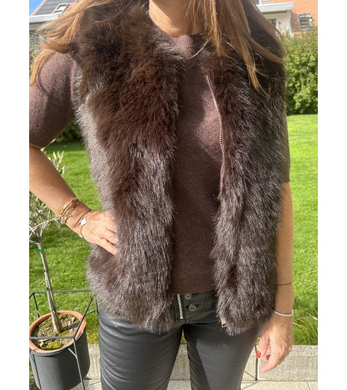Gilet chaud ultra doux au toucher et en fausse fourrure de très belle qualité. Il se ferme au moyen d'une fermeture éclair. Coupe droite avec deux poches latérales. Doublure intérieure en tissu marron.