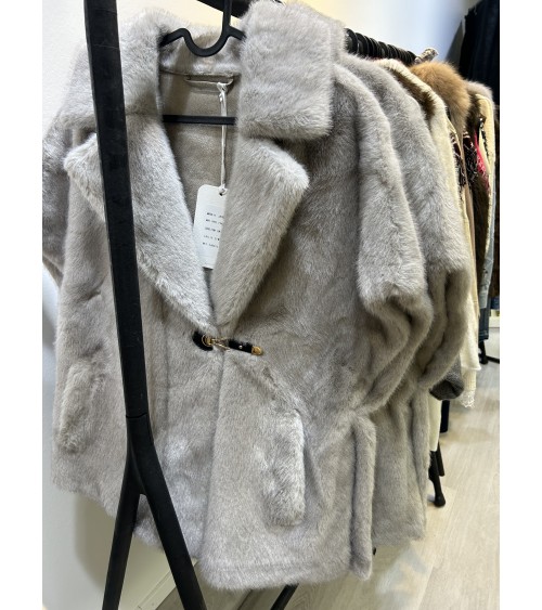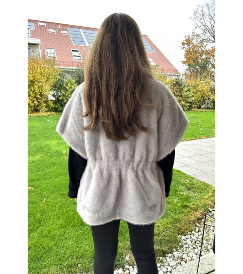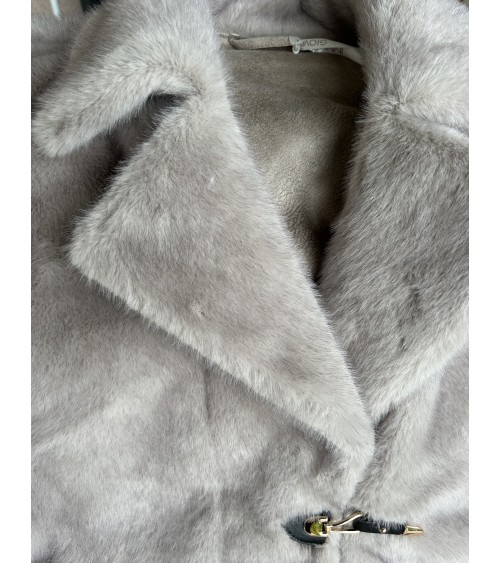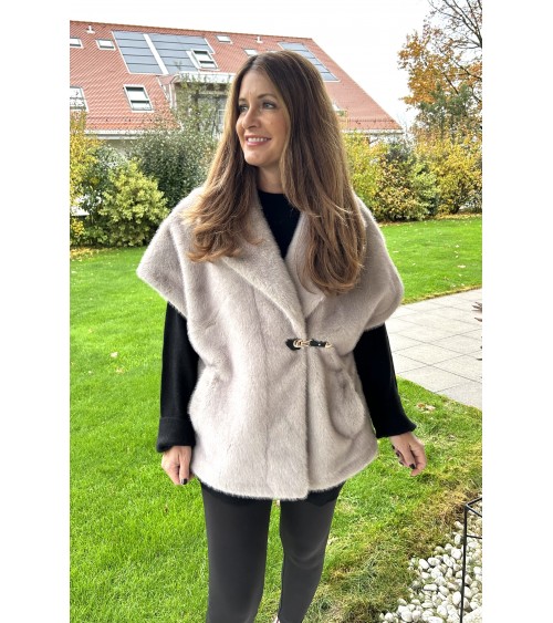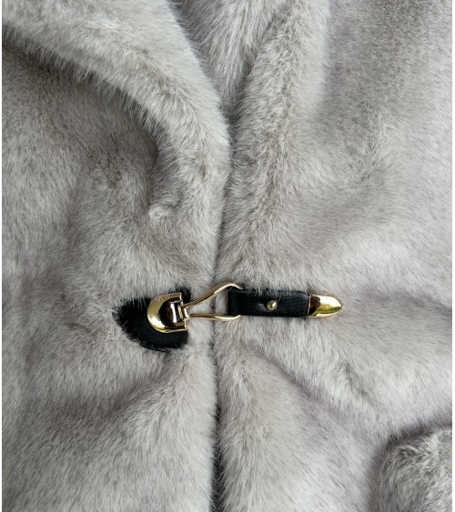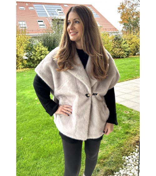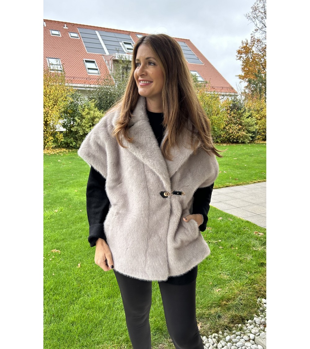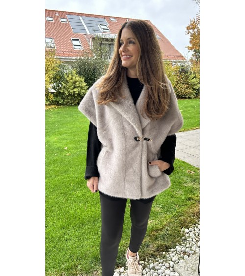 Gilet chaud ultra doux au toucher et en fausse fourrure de très belle qualité dans les tons de gris-taupe. Grand col avec fermeture par un bouton pression et mousqueton en similicuir noir et métal doré. Coupe droite avec deux poches latérales, il est resserré au dos et fendu sur les côtés. Manches courtes; idéal sur un gros pull ou une veste en cuir. Doublure intérieure en suédine gris.