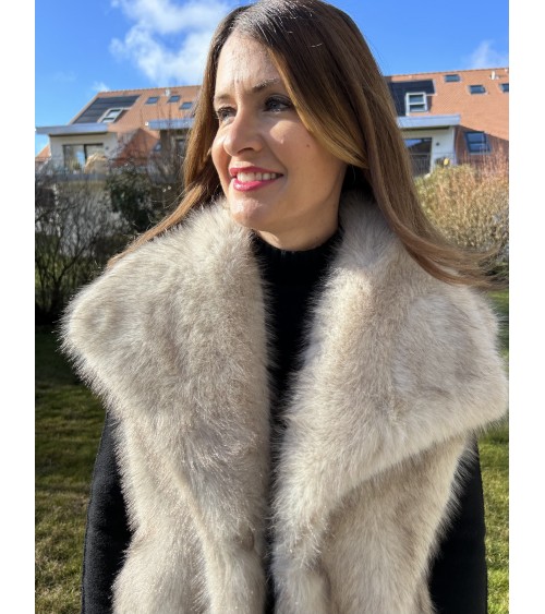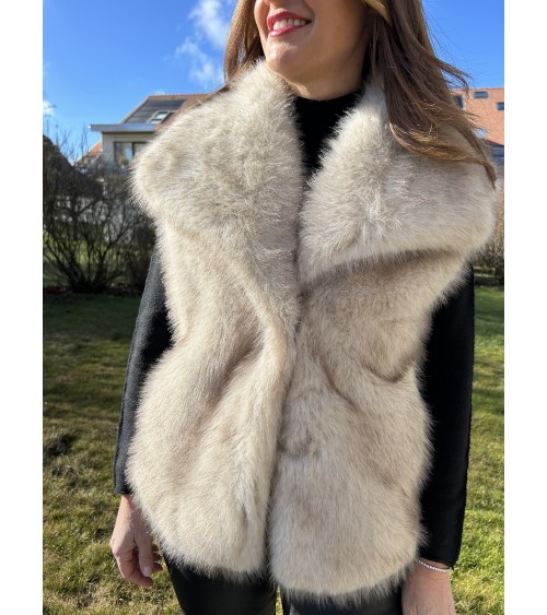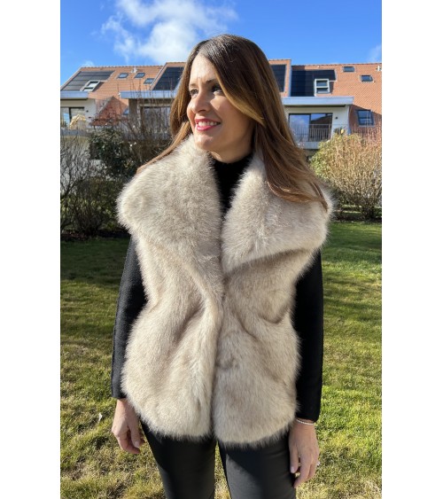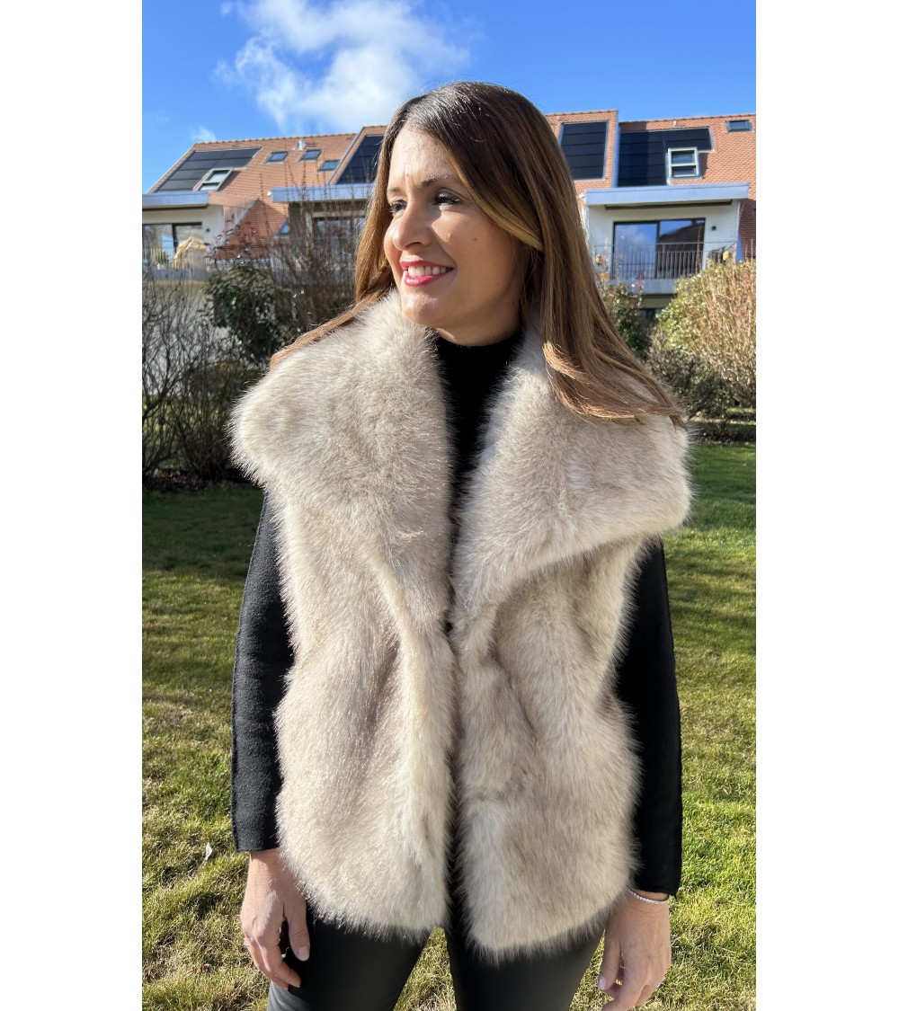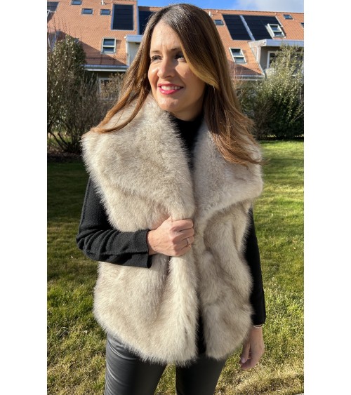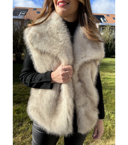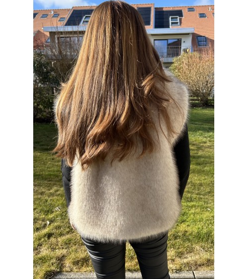 Gilet chaud ultra doux au toucher et en fausse fourrure de très belle qualité avec des reflets dans les tons de beige-marron sur fond écru. Grand col avec fermeture par un bouton pression. Coupe droite avec deux poches latérales. Doublure intérieure en tissu écru.