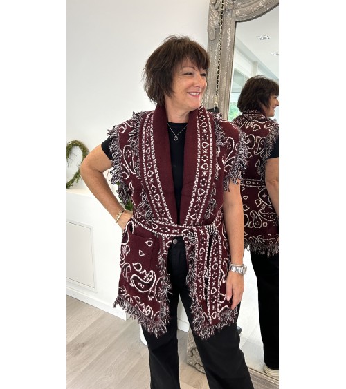 Nouveau Ajouter au panier Liste de souhaits Gilet bandana bordeaux Prix 109,00 CHF Gilet souple et chaud, touche cachemire; il est tout doux! Col avec bordure à franges. Imprimé bandana avec motifs dans les tons de noir et blanc...