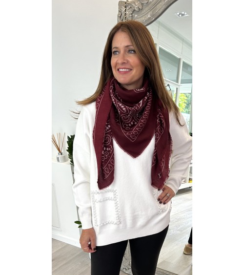 Nouveau Ajouter au panier Liste de souhaits Carré bandana bordeaux Prix 49,00 CHF Carré extrêmement doux en maille fine. Imprimé bandana, motifs bleu ciel et blanc sur fond bleu marine. Finition frangée. Existe en bordeaux...