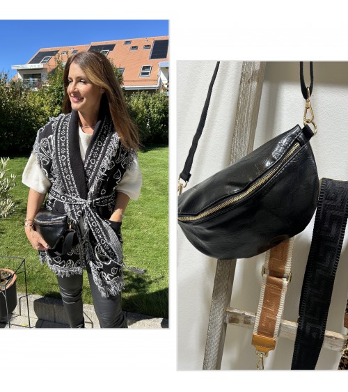 Nouveau Ajouter au panier Liste de souhaits Banane noire glacé Prix 49,00 CHF Banane en similicuir noir glacé, effet légèrement froissé. Fermeture zippée en doré. Bandoulière ajustable en tissu noir. Poche zippée à...