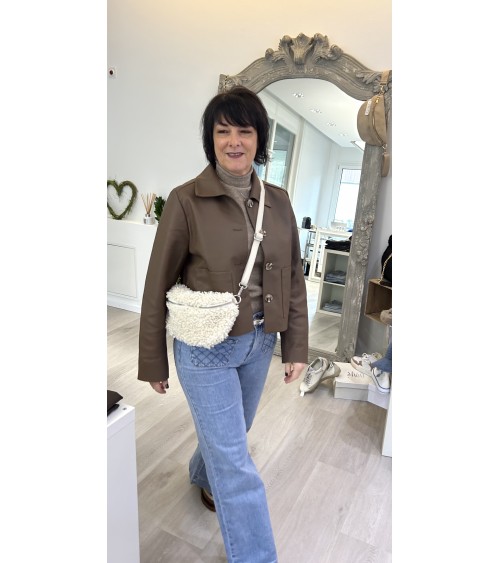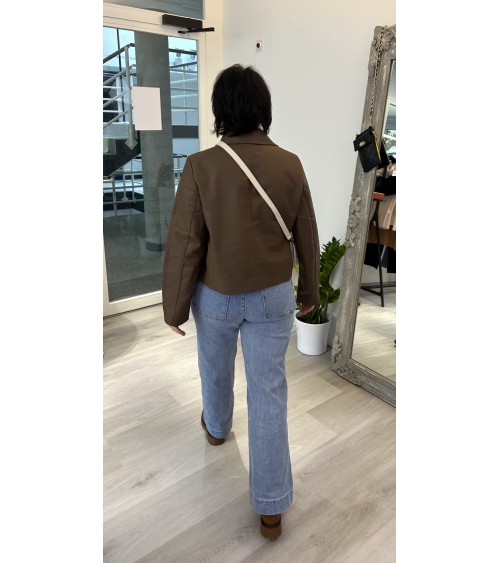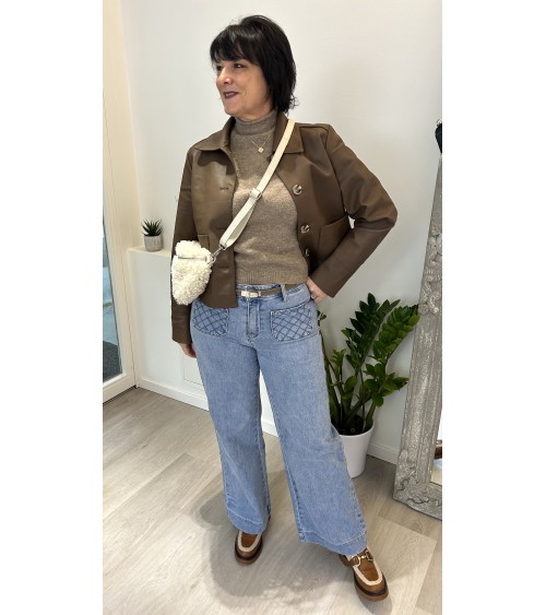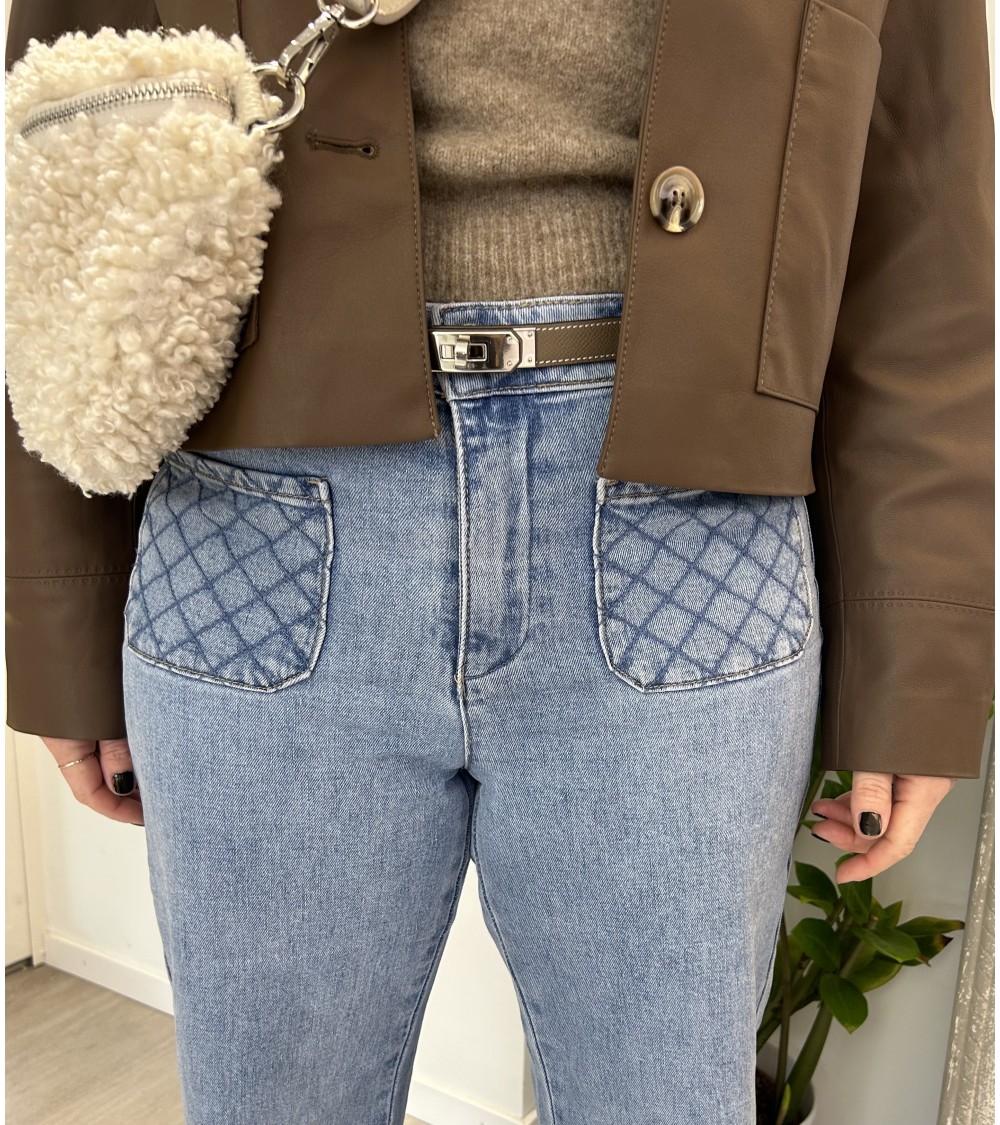 Deux poches avant avec couture à chevrons et deux poches à l'arrière. Fermeture par zip et bouton. Taille moyenne.