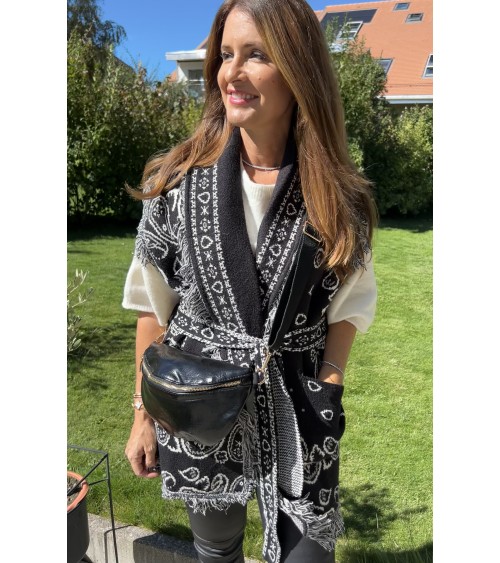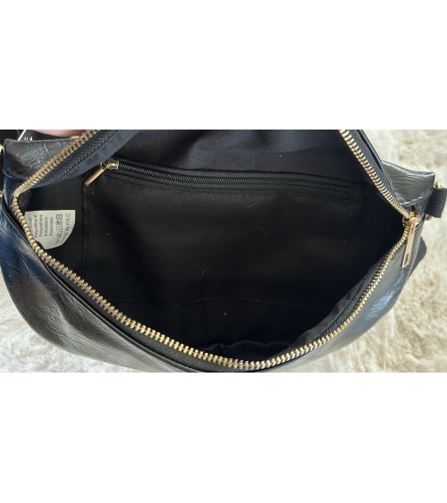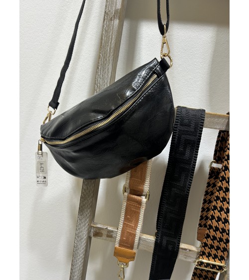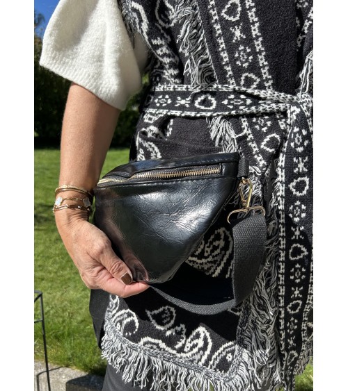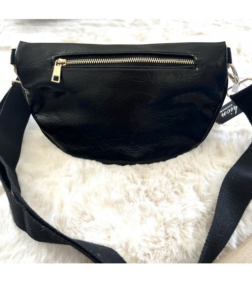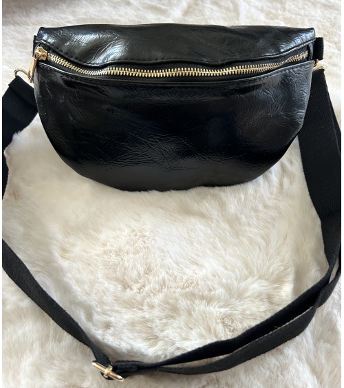 Banane en similicuir noir glacé, effet légèrement froissé. Fermeture zippée en doré. Bandoulière ajustable en tissu noir. Poche zippée à l'arrière.