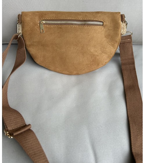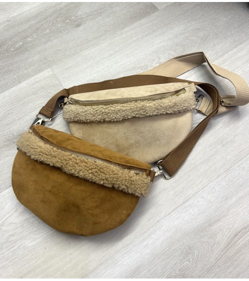 Banane en suédine camel effet daim avec une bande moutonnée. Fermeture zippée en doré. Bandoulière ajustable en tissu camel. Poche zippée à l'arrière.