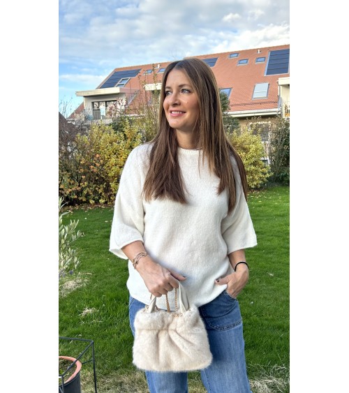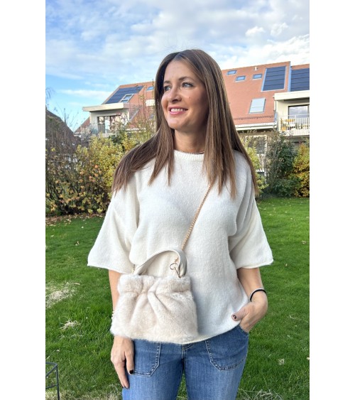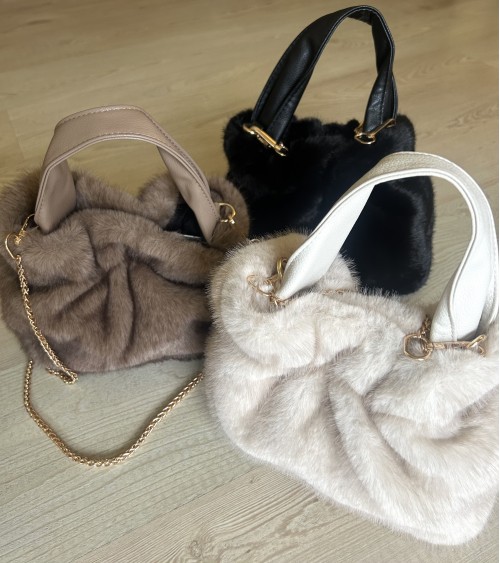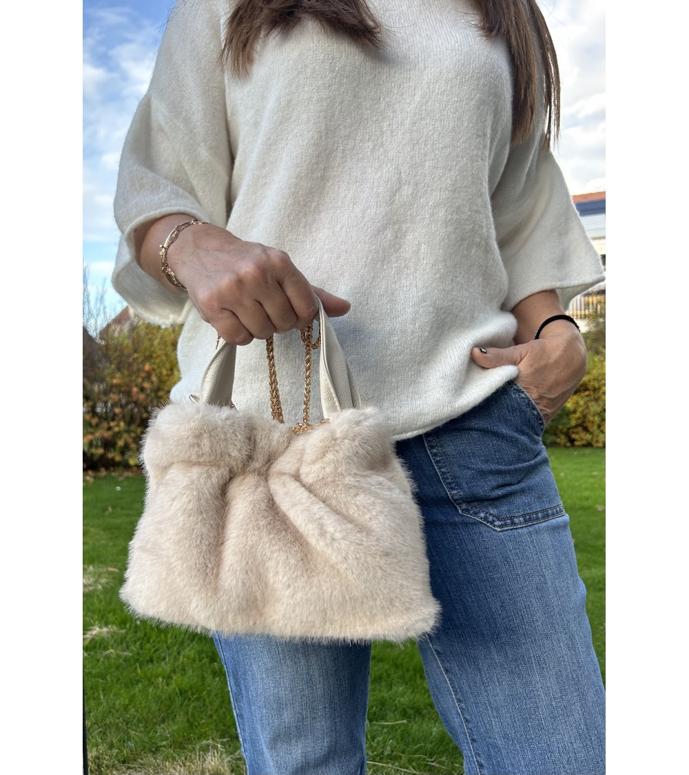 Sac ultra léger en fausse fourrure avec jolis détails froncés sur le haut. Doublure intérieure en tissu crème. Fermeture du sac au moyen d'un bouton pression. Une anse en similicuir crème et une bandoulière en chaîne dorée amovible. Base du sac en similicuir crème.