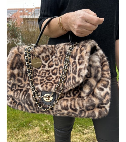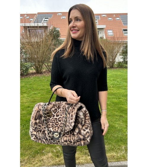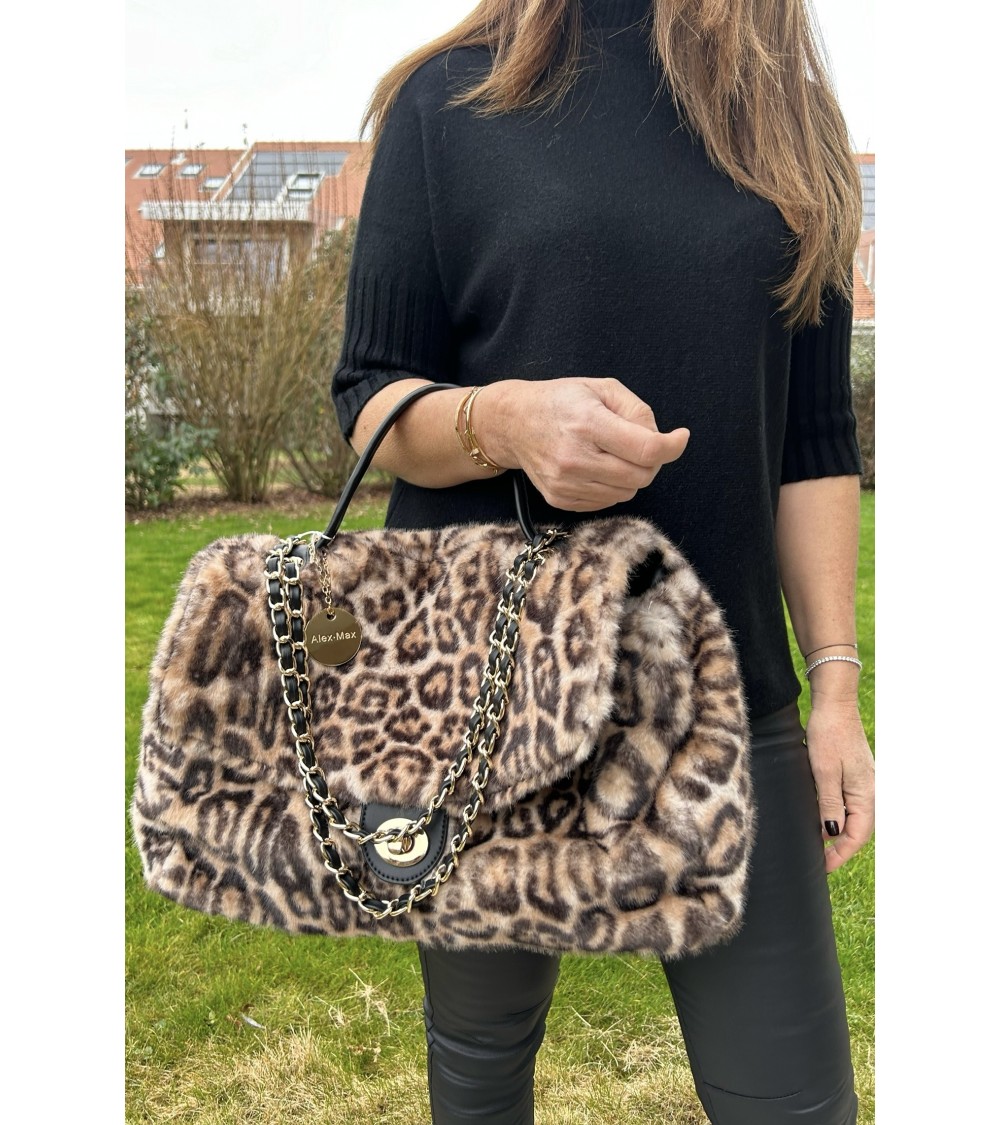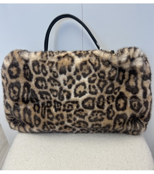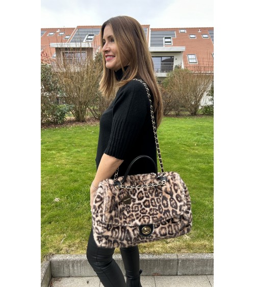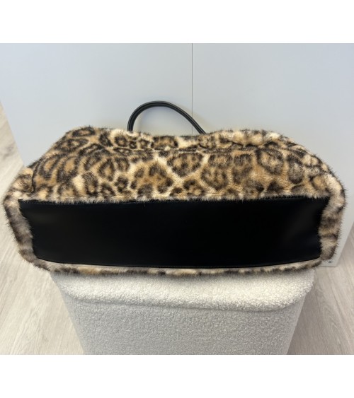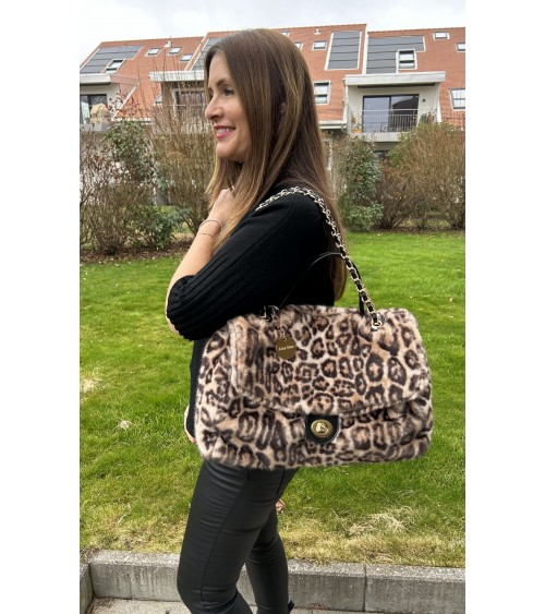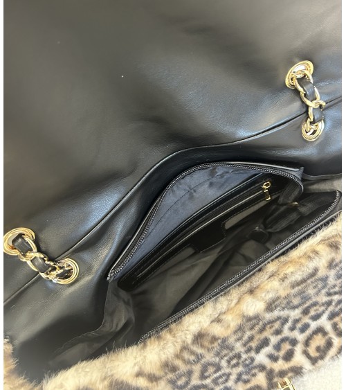 Sac XL en fausse fourrure toute douce et à l'imprimé léopard dans les tons de beige et noir. Fermeture à rabat et fermoir bijouterie dorée. Doublure intérieure en similicuir noir avec un grand compartiment et trois poches dont une zippée.