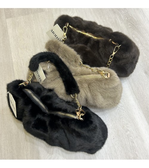 Sac ultra léger en fausse fourrure avec jolis détails froncés sur le haut. Doublure intérieure en tissu noir.  Fermeture du sac au moyen d'une fermeture éclair dorée. Une anse en fausse fourrure et chaîne dorée amovible. Base du sac structurée permettant de le poser à plat.