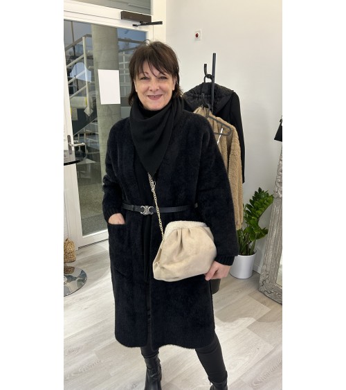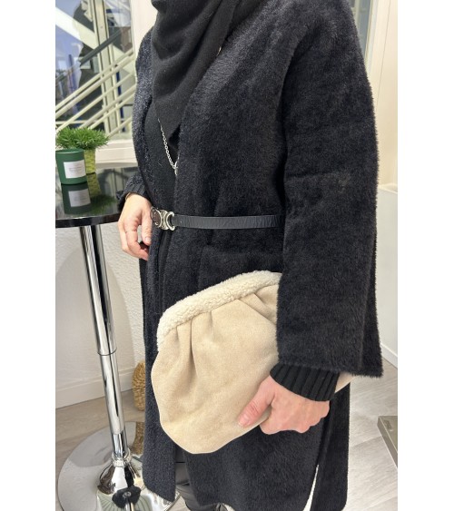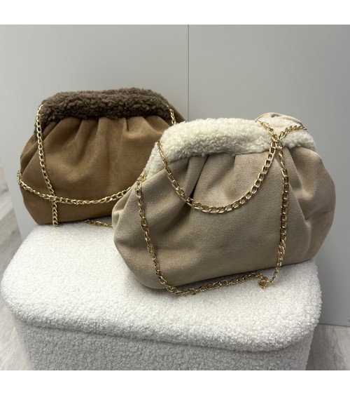 Sac pochette léger en suédine effet daim et fausse fourrure moutonnée écrue. Fermeture par clip. Doublure intérieure en tissu beige. Une bandoulière amovible en chaîne dorée. Base du sac plate permettant de le poser à plat.