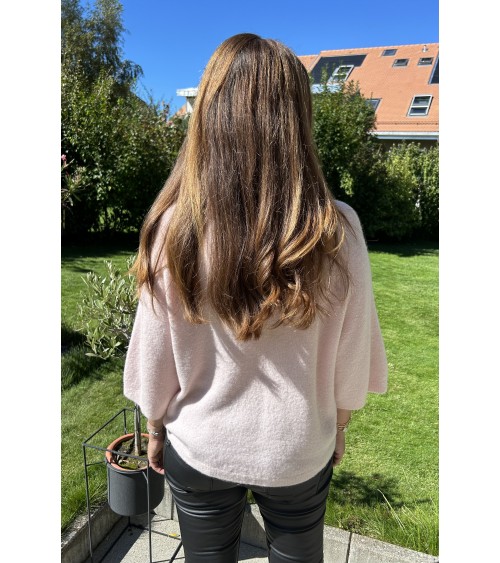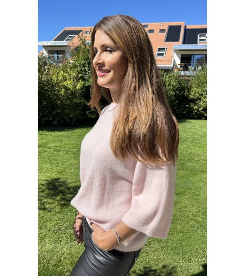 Pull tout doux, chaud et léger en fine maille tricotée. Encolure arrondie et coupe droite légèrement oversize. Emmanchure basse et manches 3/4. Bas du pull en finition bord côte.