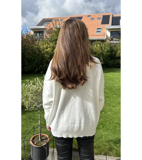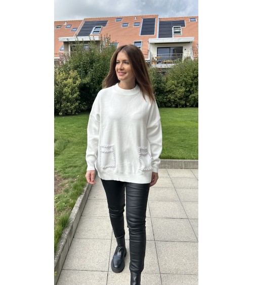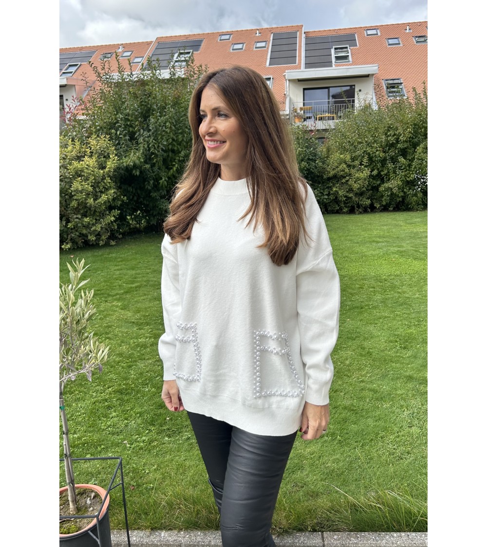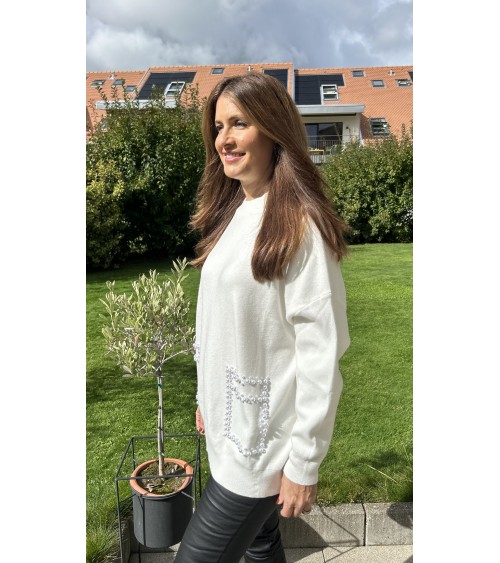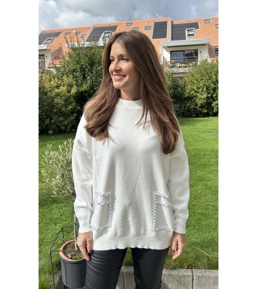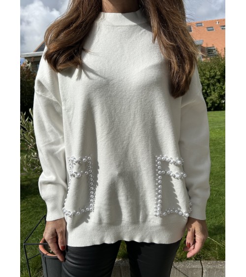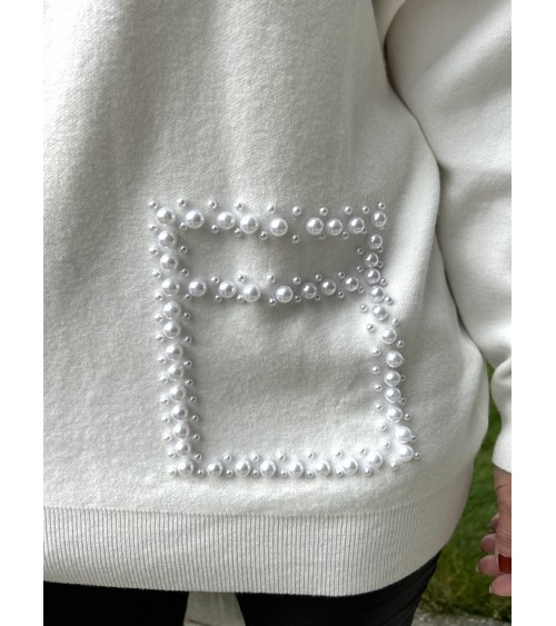 Pull mi-long souple et stretch en viscose. Col montant et coupe droite légèrement oversize. Il est accessoirisé de perles de culture qui donnent l'illusion de deux poches sur le bas du pull.