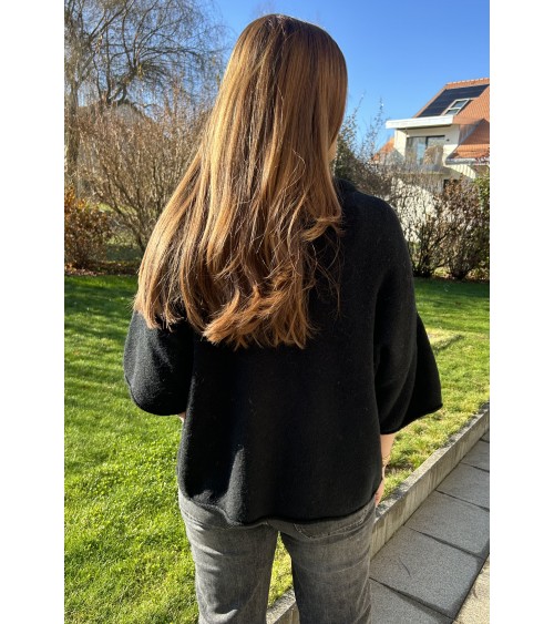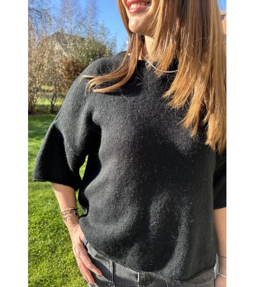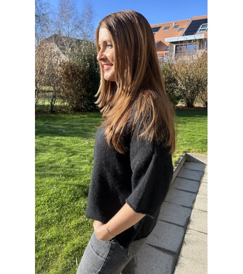 Pull tout doux et chaud en fine maille tricotée. Encolure arrondie et coupe oversize. Emmanchure basse et manches 3/4. Bas du pull en finition bord roulotté.