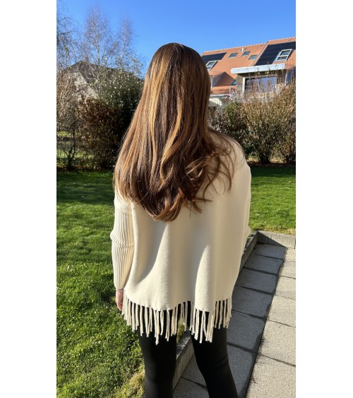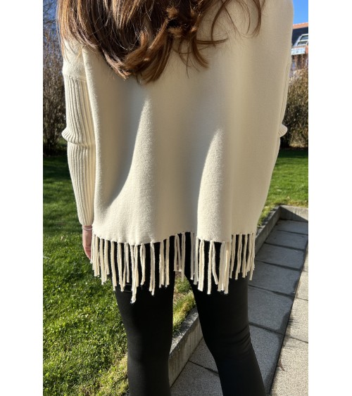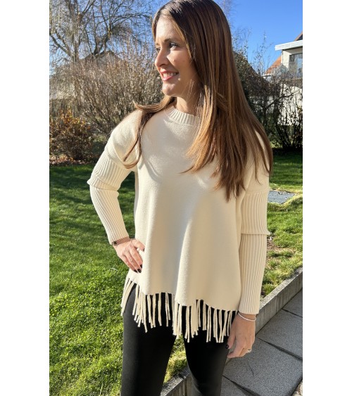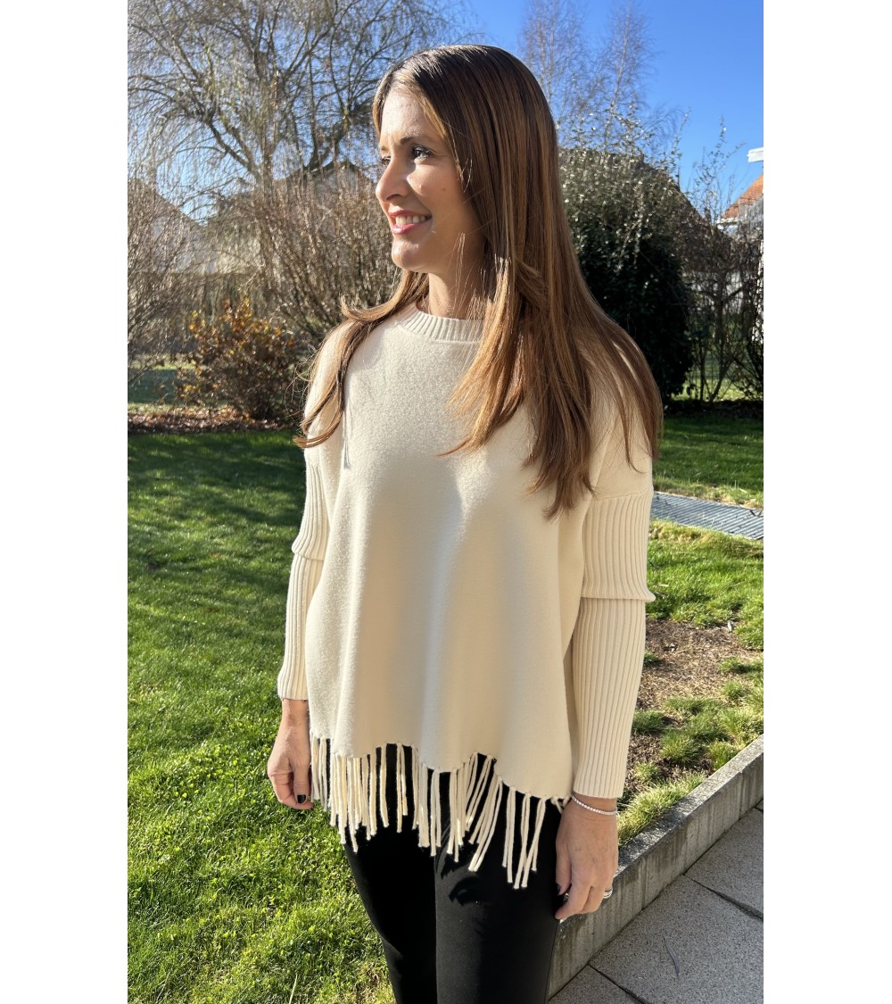 Coupe droite légèrement oversize et bas du pull finition frangée.