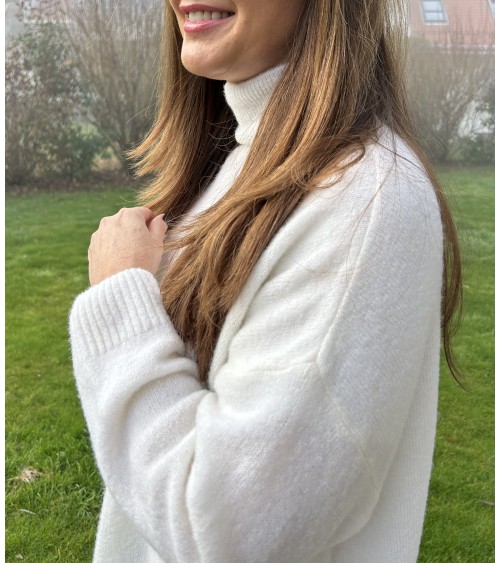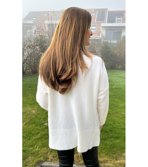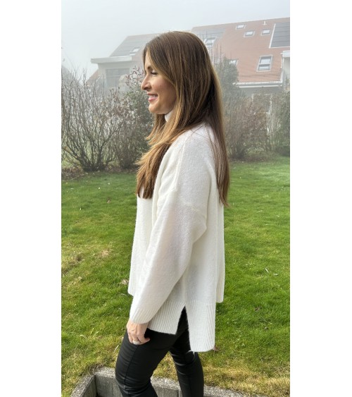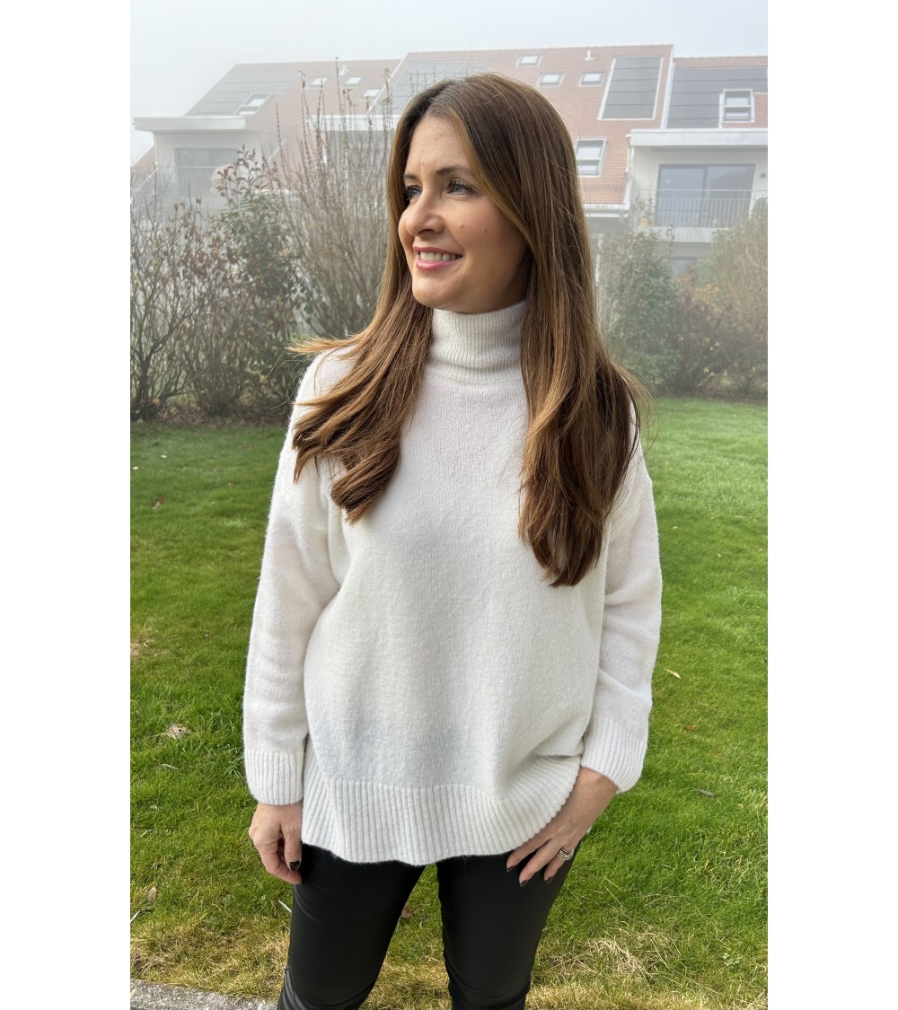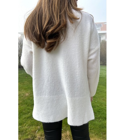 Pull tout doux et chaud en fine maille tricotée. Col montant et coupe oversize. Il est fendu sur les côtés et plus long sur l'arrière. Emmanchure basse et manches longues. Bas du pull en finition bord-côte.